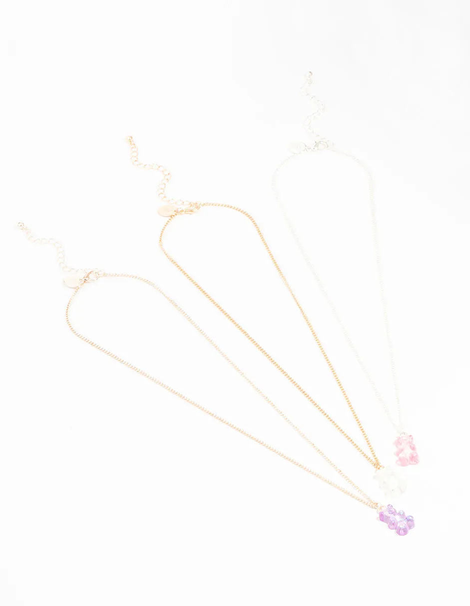 Surprise your loved ones with this delightful necklace trio. This set includes purple, pink, and white teddy bear pendants with a holographic effect. It's perfect for someone who enjoys a sweet and stylish touch.